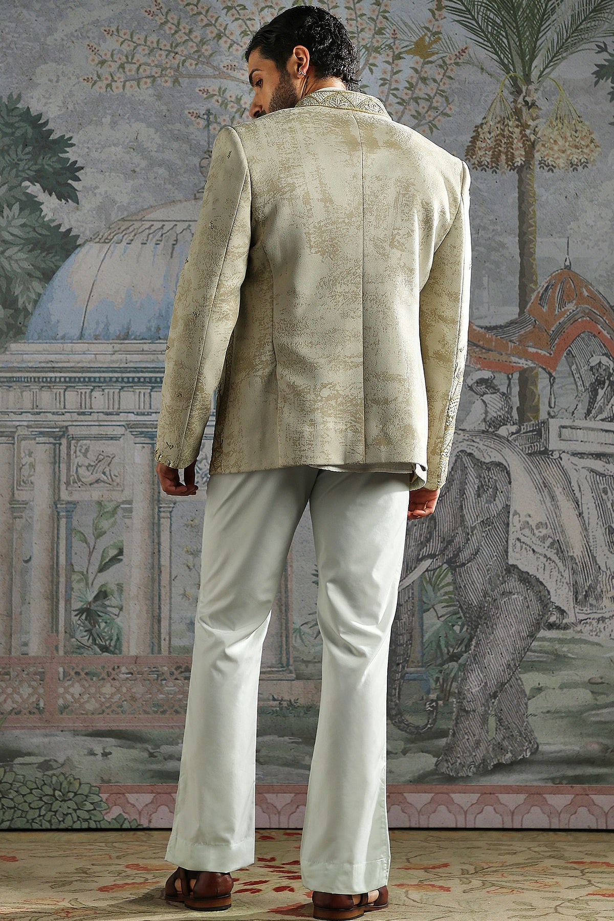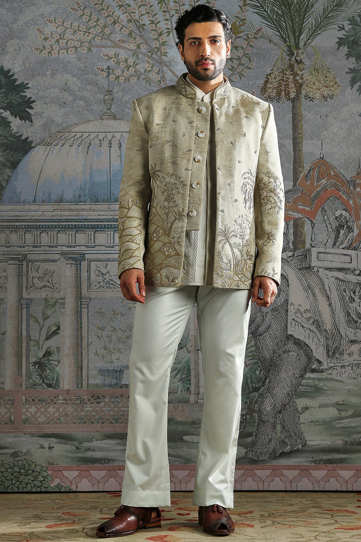 An ivory bandhgala embellished with heirloom-style motifs in multi-tone threadwork. Elegant, polished, and ideal for sophisticated wedding events.