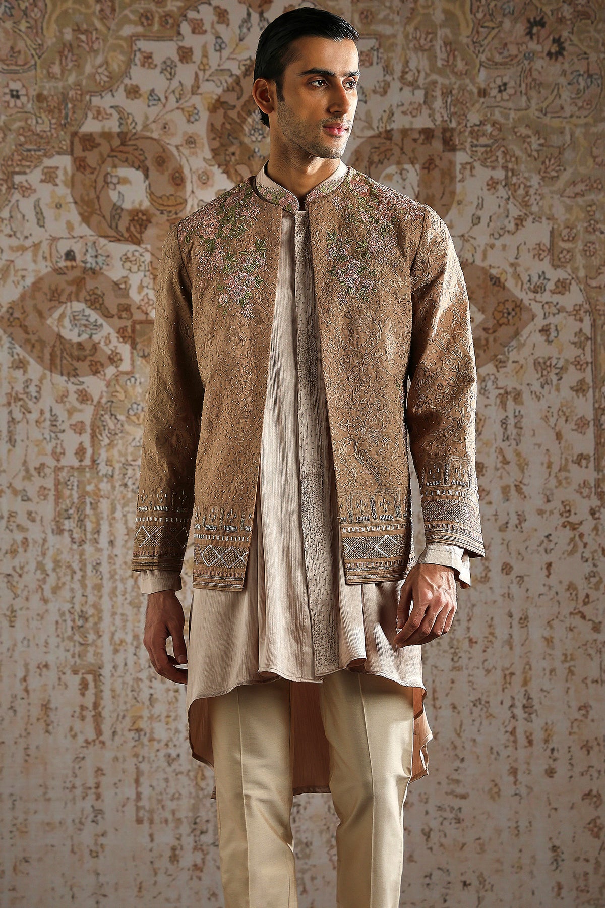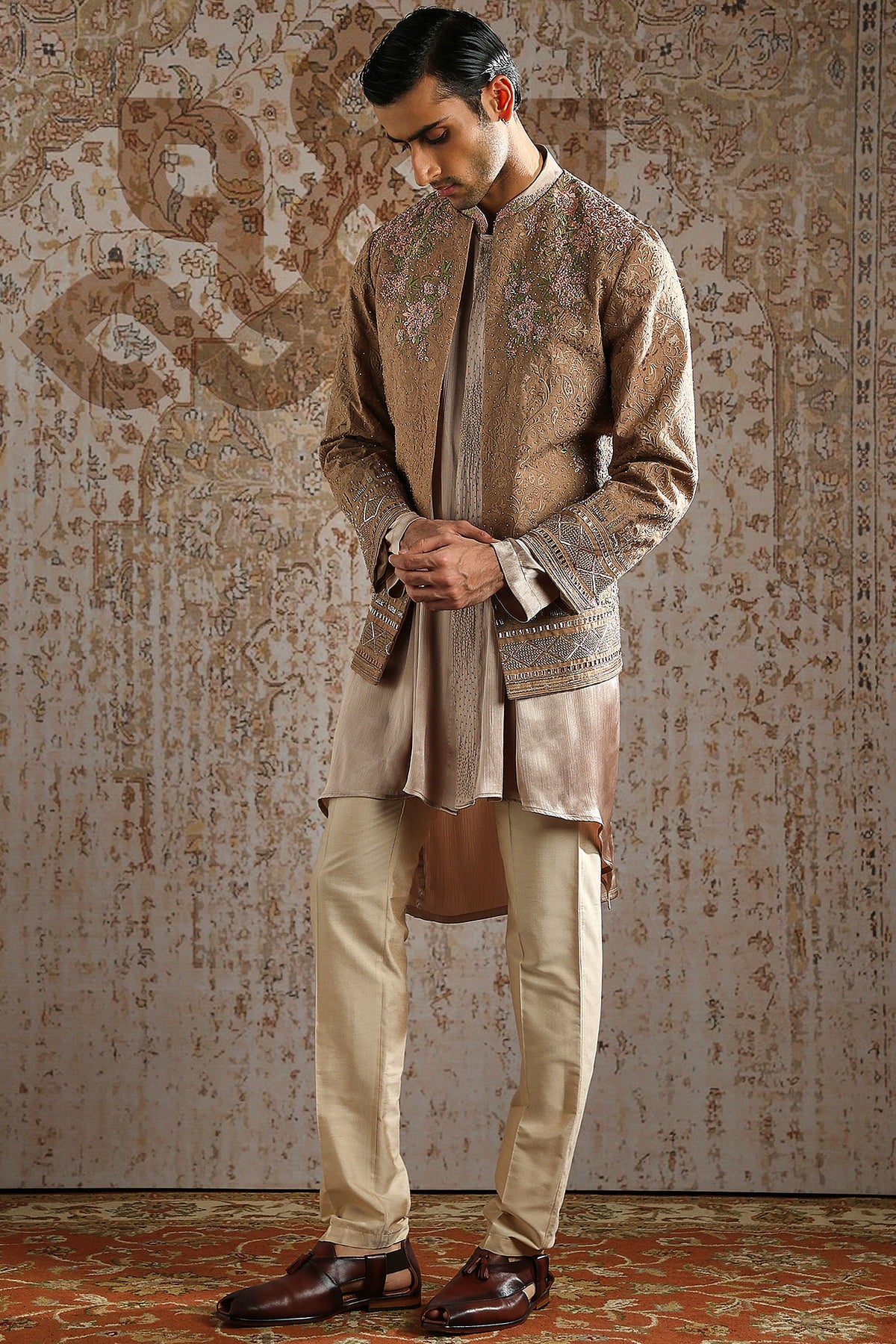 A champagne-toned bandhgala featuring intricate tonal thread embroidery with floral and geometric textures. Paired with a layered kurta and tapered trousers, this look exudes understated opulence and refined ceremonial charm.