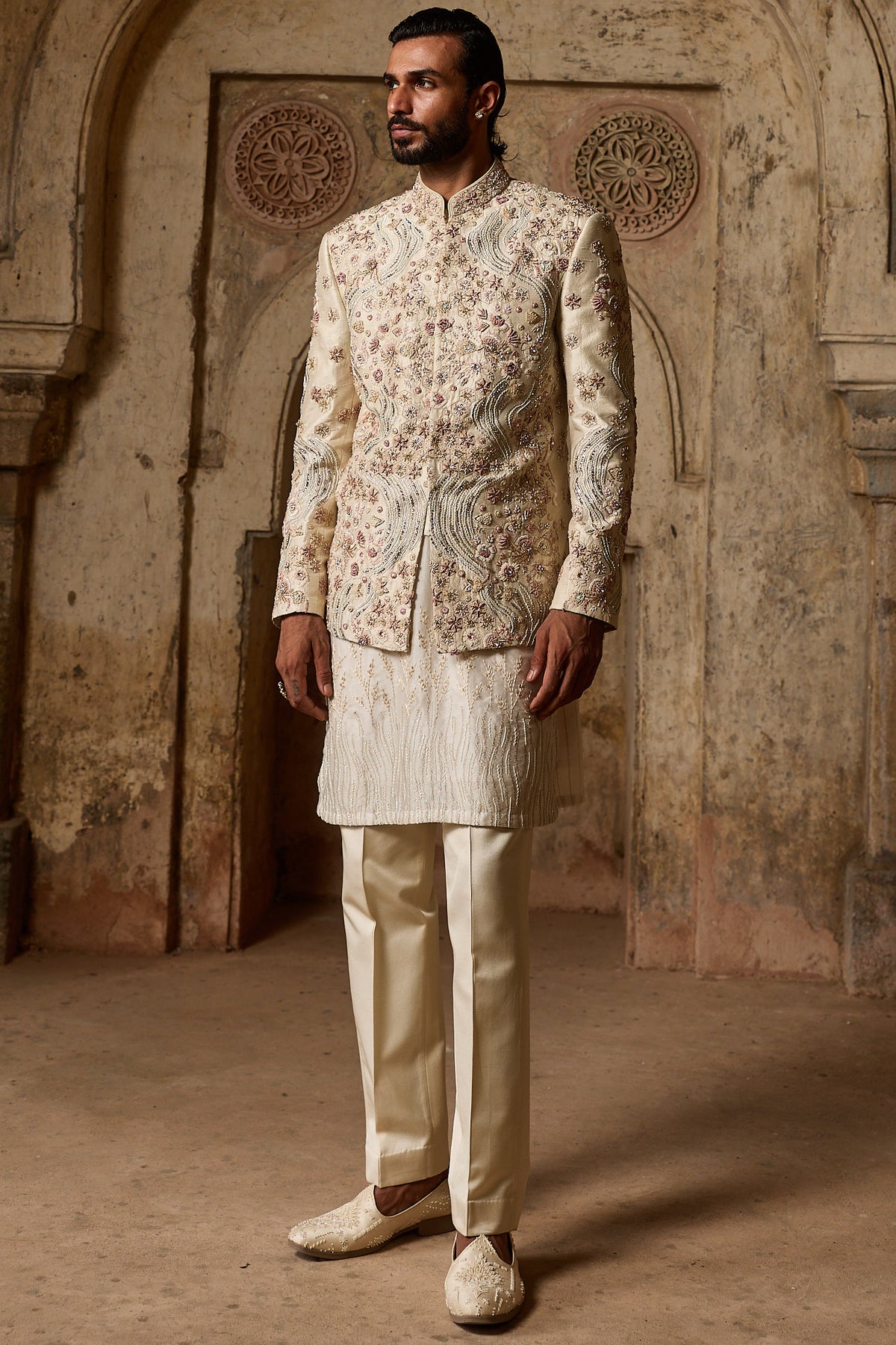 An off-white raw silk takkar bandhgala set paired with a chanderi kurta and straight pants. Handcrafted with Swarovski, stones, resham, dabka, baadla, cutdana and sequins. A regal and magnificent statement of couture luxury.