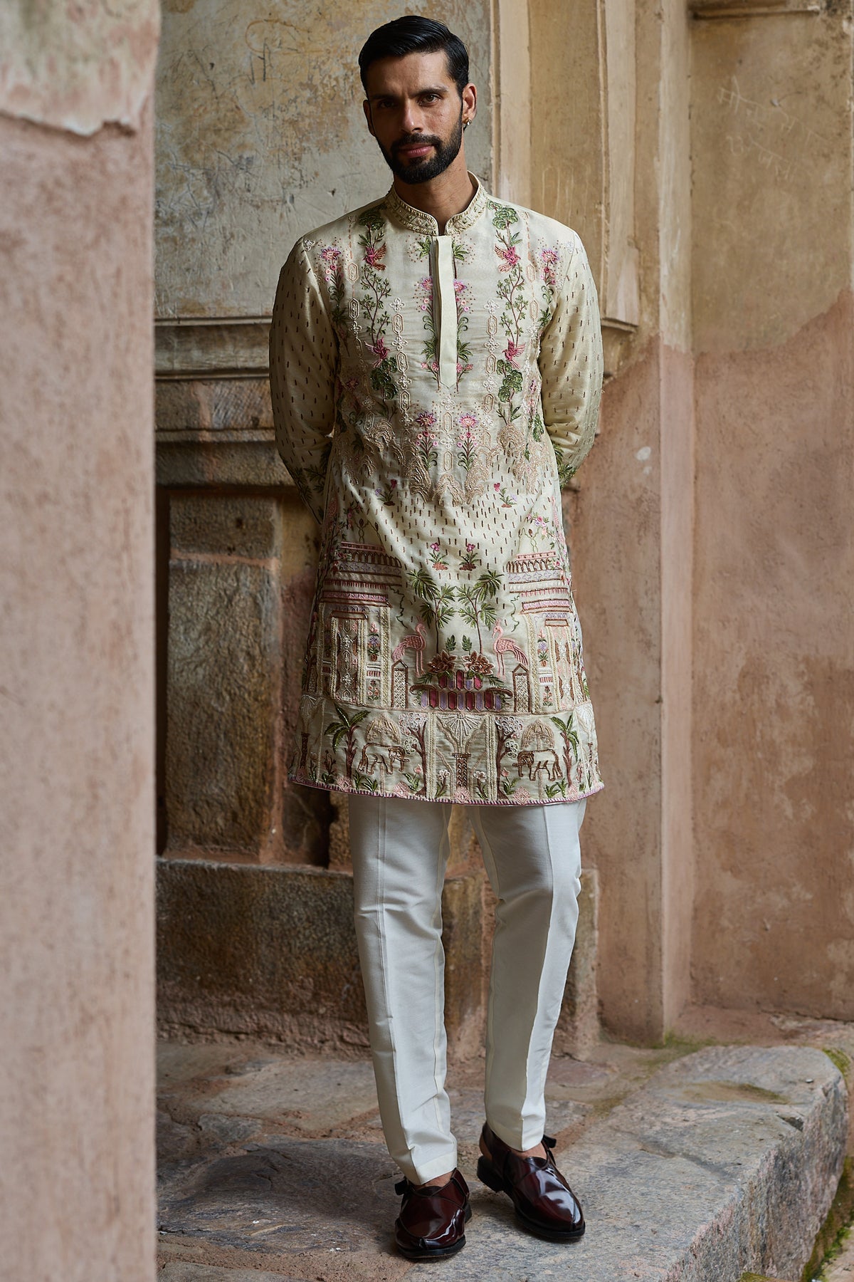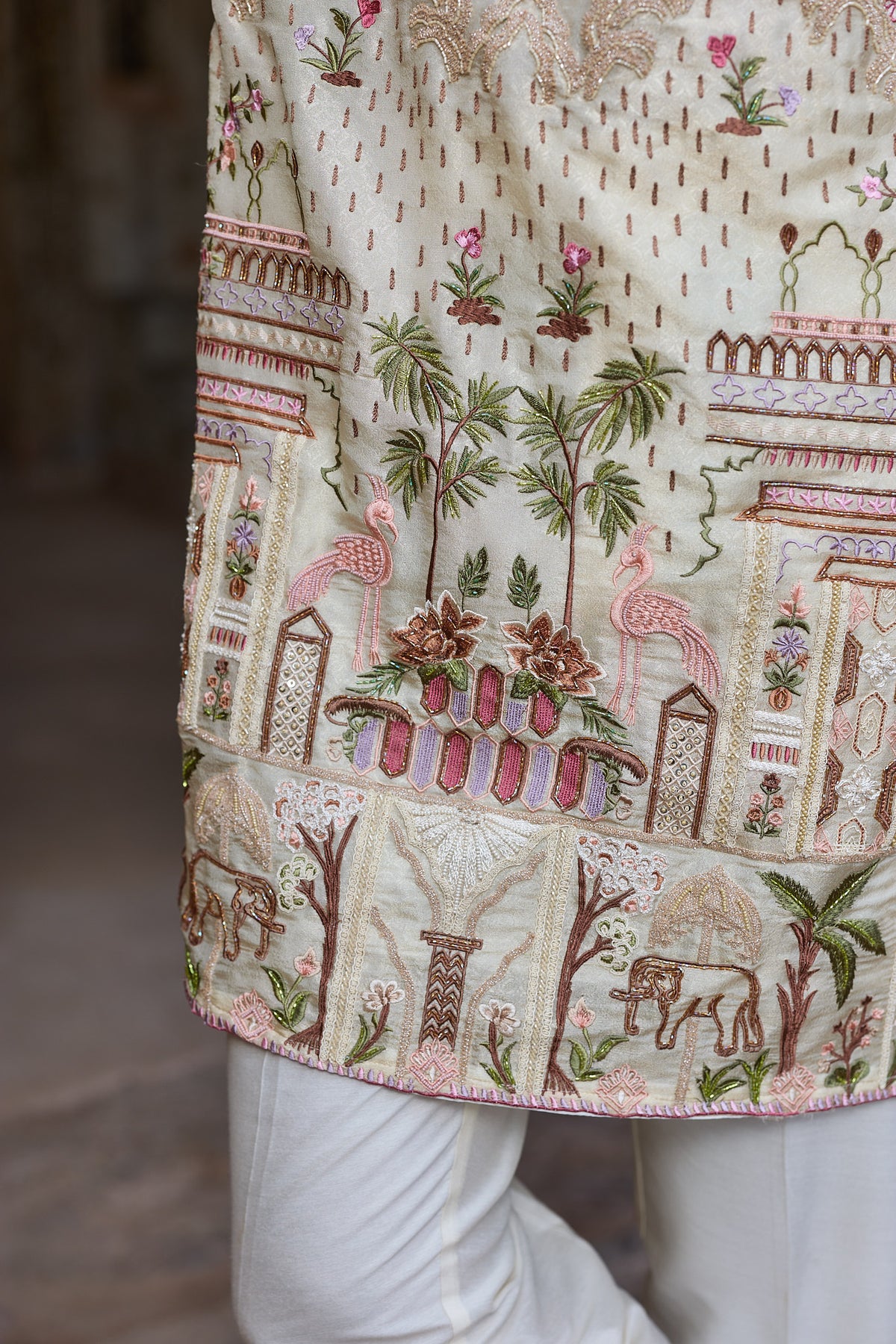 A golden shimmer tissue kurta set, styled with a matching pyjama. The tropical theme comes alive through hand-embroidered thread and dori motifs, enriched with katdana and delicate hand embellishments. The fabricÕs natural glow creates a luminous presence, while the craftsmanship lends depth and intricacy. The result is an ensemble that gleams like a mirage Ñ ethereal, festive and regal in every detail.