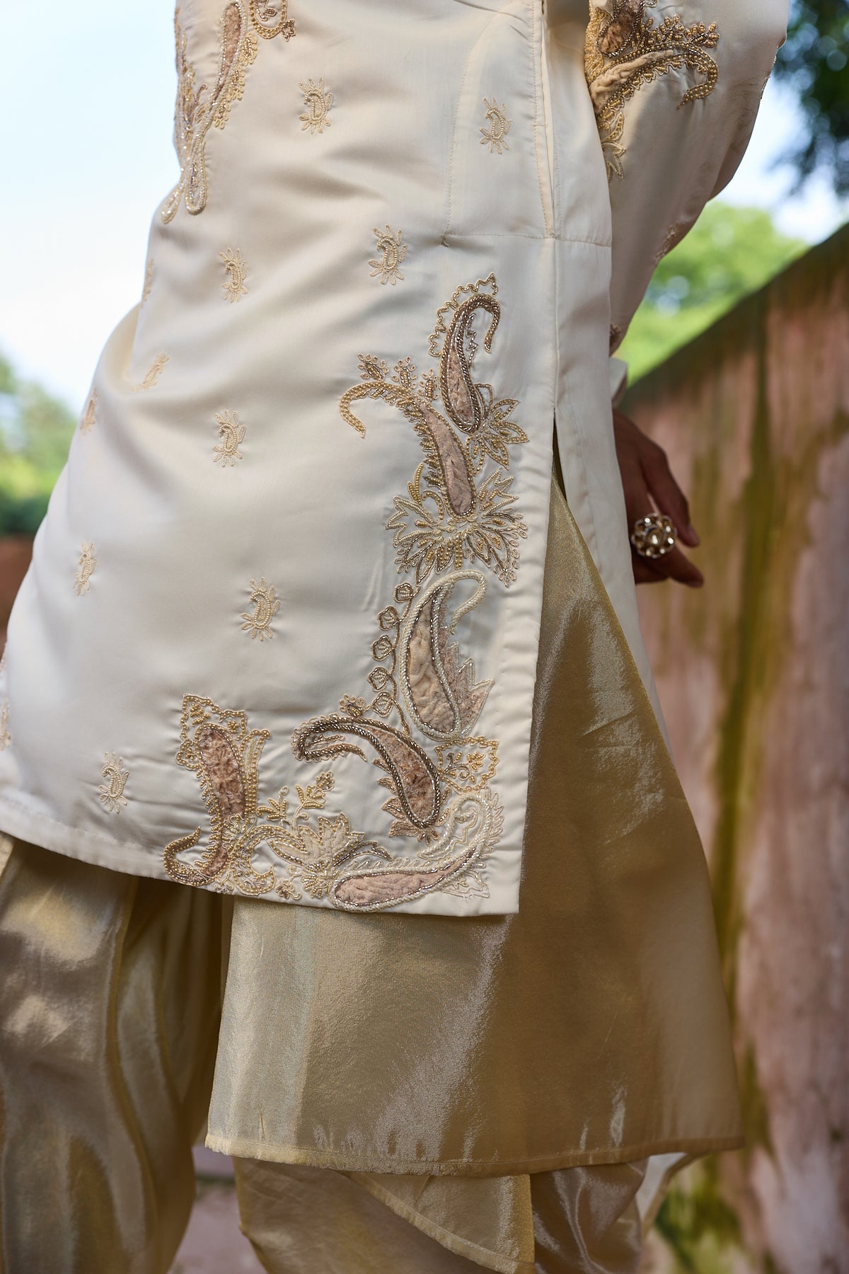 An ivory palm silk kurta set paired with a veshti pyjama. Featuring paisley-inspired patchwork embroidery, enhanced with tonal katdana and moti, and detailed with a refined zipper closure. The interplay of tradition and contemporary tailoring makes this ensemble a regal interpretation of heritage redefined for today's era.