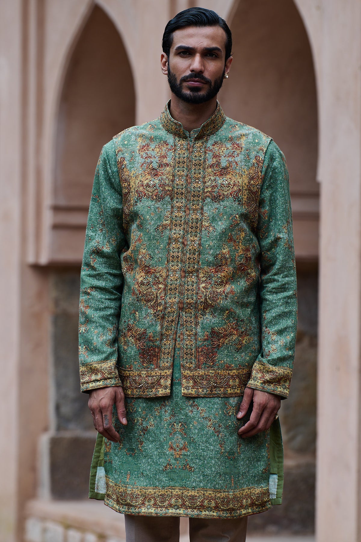 An earthy green bundi kurta set in cotton linen styled with straight pants. Printed with carpet-inspired textures, finished with resham embroidery and French knots. A design that bridges rustic charm with artisanal elegance.