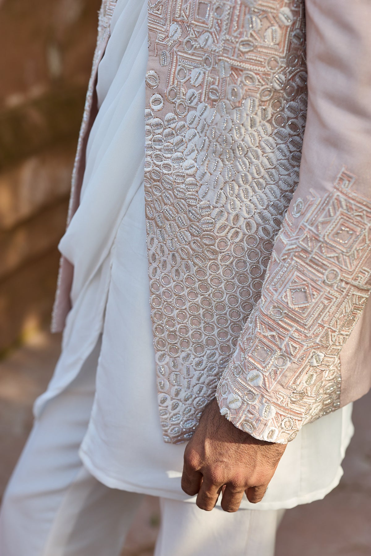 A pastel pink bandhgala in raw silk, paired with an ivory georgette drape kurta. The bandhgala is intricately embroidered with multi-thread motifs and highlighted with katdana work. Romantic pastel hues paired with contemporary styling define this refined ensemble.